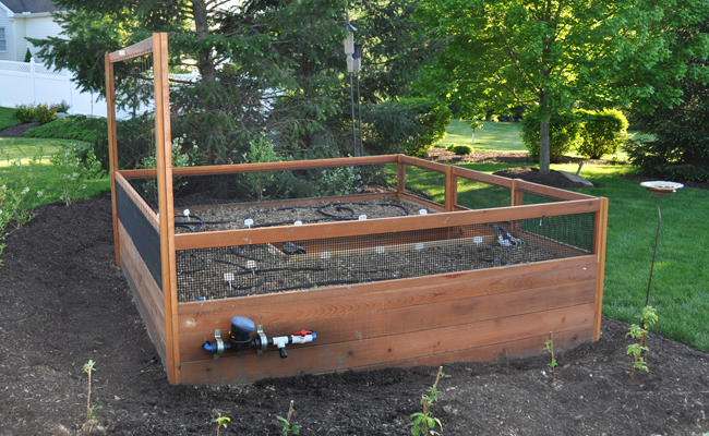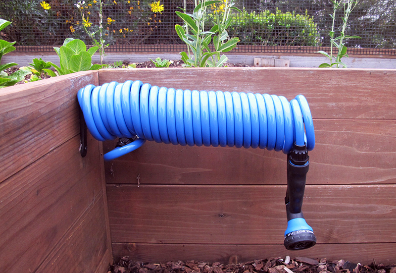 We also include a coil hose and hose holder along with a vegetable sprayer. You can manually spray your plants if you choose to, or use the hose to wash your hands. The coil hose is conveniently mounted in the walkway of the fenced garden.